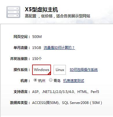 | 操作系統(tǒng)Aliyun Linux 64位WIN08Web服務(wù)Apache2.2.16IIS7.5獨立網(wǎng)頁空間500M500M獨立日志空間10M10M月流量上限15G15G帶寬上限1000M共享1000M共享并發(fā)連接數(shù)150個150個域名綁定數(shù)量5個5個機房線路BGP多線BGP多線支持語言:PHP4/5、HTML、WAP、Perl5、獨立cgi-binASP、.NET1.1/2.0/3.5/4.0、HTML、Perl5數(shù)據(jù)庫類型:MySQL5.1.48(50M)、SQLite v2.8.14ACCESS(限50M)、SQL Server2008(50M) |