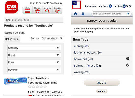 CVS使用下拉菜單中的“篩選”選項(xiàng)卡中進(jìn)行篩選。選擇一個(gè)菜單選項(xiàng),將立即對(duì)結(jié)果進(jìn)行篩選。JC Penney公司提供了一個(gè)下拉列表中,選擇過(guò)濾器和顯示產(chǎn)品的數(shù)量相匹配的過(guò)濾器值。JC Penney公司也可以在一個(gè)屏幕上,貿(mào)易是購(gòu)物者點(diǎn)擊“應(yīng)用”按鈕被選中多個(gè)值從一個(gè)方面。