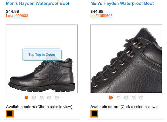 Payless使用一個(gè)swipeable的畫廊,從不同的角度,以顯示其產(chǎn)品。用戶也可以點(diǎn)擊放大才能看到細(xì)節(jié),如縫合和扣眼。