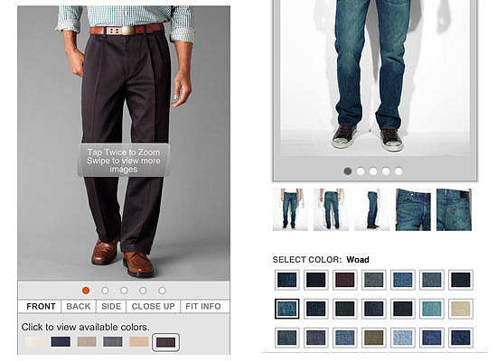 碼頭工人(上圖左)有一個(gè)swipeable照片畫廊,雙,挖掘到放大的細(xì)節(jié)的,消費(fèi)者可以看到一個(gè)產(chǎn)品在不同的顏色。列維的(右上圖)采取了類似的做法,加上縮略圖的表示照片在畫廊的角度。泊塢窗“網(wǎng)站上選擇一個(gè)新的顏色會(huì)導(dǎo)致整頁(yè)刷新,而李維斯沒(méi)有。