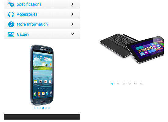 三星(左上圖)和戴爾(上圖右)都使用他們的產(chǎn)品swipeable照片畫廊。三星采用了畫廊到的手風(fēng)琴在其產(chǎn)品上,而戴爾使用一個(gè)單獨(dú)的頁(yè)面。