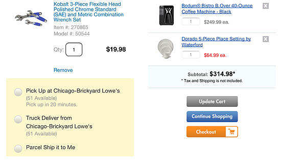 每個(gè)表行的羅威的購(gòu)物車(左上圖)允許用戶刪除相應(yīng)的產(chǎn)品從他們的車,它包括用于運(yùn)輸或店內(nèi)取貨的選項(xiàng)。床浴和超越(右上圖)也允許刪除的項(xiàng)目;表中的每一項(xiàng)產(chǎn)品的數(shù)量可以改變一個(gè)按鈕上越走越遠(yuǎn)更新的頁(yè)面。