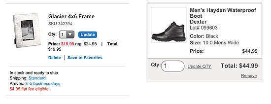 板條箱和桶(左上圖),允許用戶刪除產(chǎn)品,保存到收藏夾和更新數(shù)量的表中的行。每一行還包括運(yùn)輸成本和交貨時(shí)間等信息。Payless(右上圖),也可以讓消費(fèi)者更新的數(shù)量和刪除項(xiàng)目,它的車還提供了一個(gè)選擇的交付選項(xiàng),包括將產(chǎn)品送到一個(gè)Payless專賣店(未顯示)。