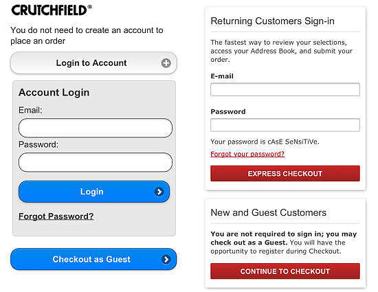克拉奇菲爾德和諾德斯特龍都允許客戶檢查作為嘉賓或通過(guò)使用他們現(xiàn)有的帳戶。讓手機(jī)購(gòu)物已簽出作為嘉賓把他們的訂單后,創(chuàng)建一個(gè)帳戶和密碼重置都支持。