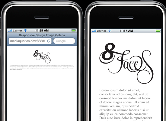 在iPhone及iPod Touch中,頁面會被自動的同比例縮小至最適合屏幕大小的尺寸,x軸不會產(chǎn)生滾動條,用戶可以上下拖拽瀏覽全部頁面,或在需要的時候放大頁面的局部。這里會產(chǎn)生一個問題,即使我們運用響應(yīng)式Web設(shè)計的思想,專門為iPhone的小屏輸出小圖片,它同樣會隨著整個頁面一起被同比例縮小,如下圖左側(cè)所示。