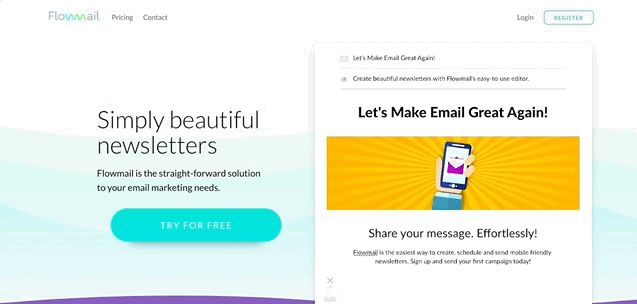 Flowmail是一個電子郵件新聞組的網(wǎng)站,它有一個漂亮的登錄頁面。 在右側,一個小動畫清楚地顯示了該工具如何以簡單,有吸引力和快速的方式設計自己的訂閱電子郵件。 動畫的內(nèi)容回應了產(chǎn)品的介紹,最終CTA自然出現(xiàn)。 設計非常精巧和巧妙。