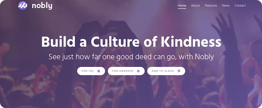 Nobly是一款社交應用程序,您可以與想要為世界做一件好事的所有人聯(lián)系。 打開網(wǎng)站后,您會看到主頁的大圖,它吸引了人們的注意力,大膽的色彩和點綴。 該網(wǎng)站使用現(xiàn)在流行的簡單布局和單頁滾動設計。