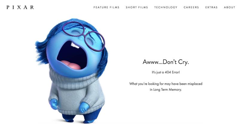 皮克斯的404頁(yè)面使用“特務(wù)團(tuán)隊(duì)”中的“擔(dān)心”在屏幕上哭泣,并附有“Awww ... Do not Cry”字樣。