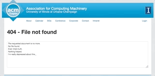 這是伊利諾伊州Champaign計(jì)算機(jī)協(xié)會(huì)網(wǎng)站的404頁(yè)面,其中一段文字將會(huì)一個(gè)接一個(gè)地寫,告訴你,它無(wú)法找到該頁(yè)面,甚至“爬到垃圾箱并 分解自己?!?/p>