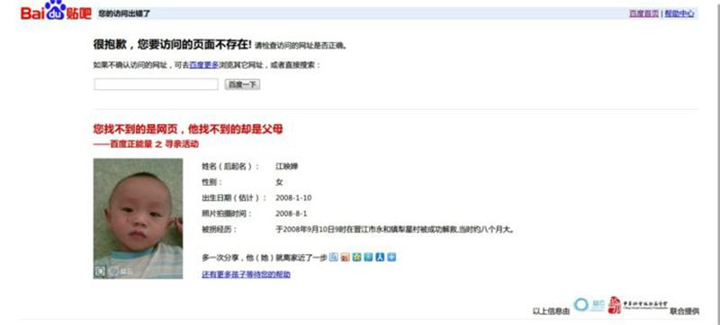 騰訊,百度和網(wǎng)易的“404頁(yè)”都缺少兒童信息。 這404頁(yè)面允許用戶在404頁(yè)面中嵌入一個(gè)簡(jiǎn)單的代碼。 通過(guò)此頁(yè)面顯示失蹤兒童的信息,反映公司對(duì)公益的態(tài)度。。
